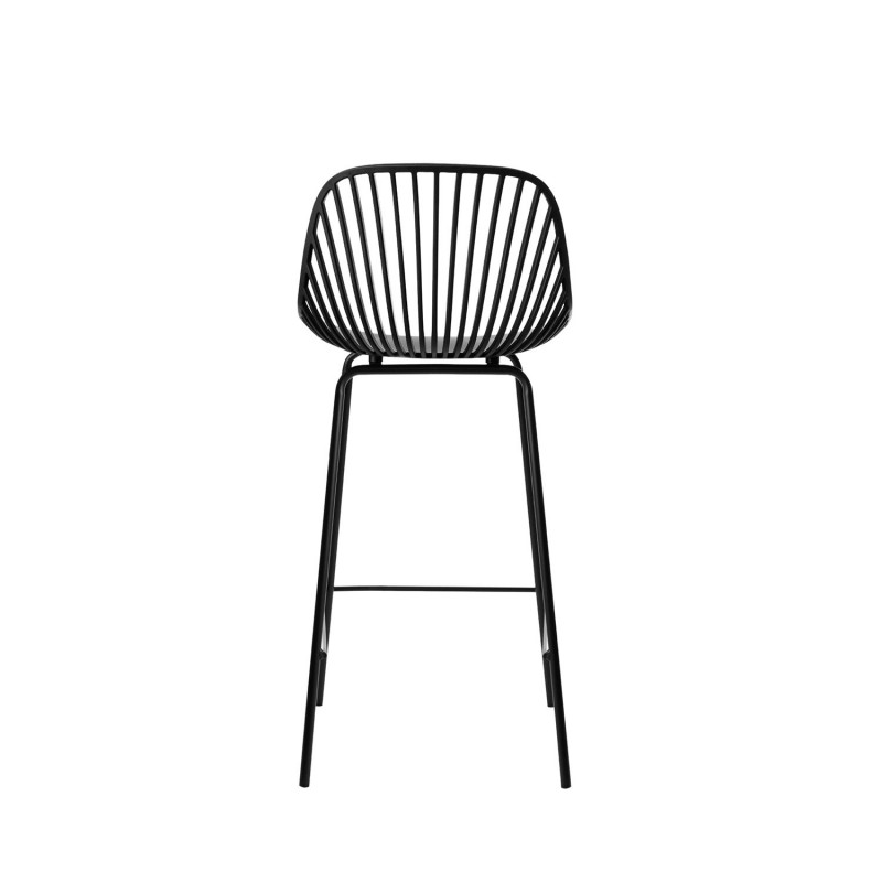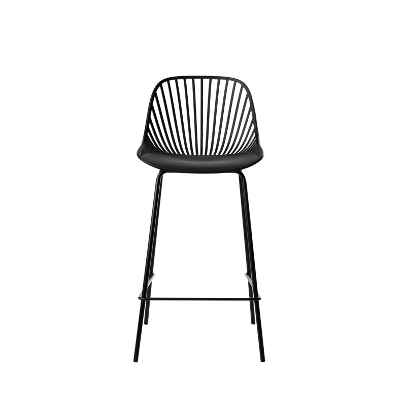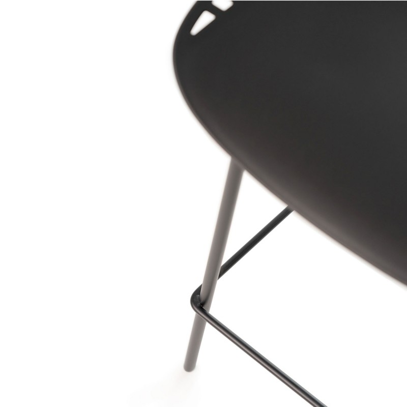 El taburete bajo PEYTON destaca por su diseño original, con un respaldo abierto compuesto por pequeñas barras verticales y un asiento de polipropileno en color negro, todo en una misma pieza.Sus patas, de metal lacado en mate, incluyen un reposapiés que proporciona mayor estabilidad y comodidad.Este taburete es perfecto para cualquier ambiente, gracias a su estilo moderno y versátil.