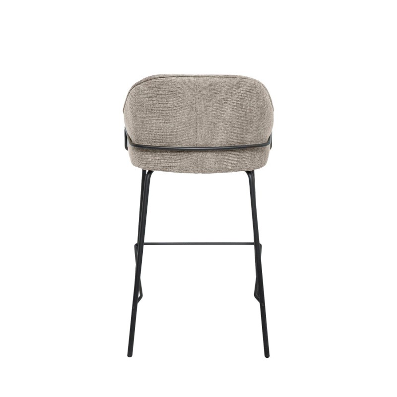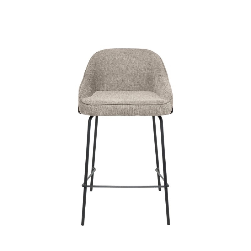 Taburete bajo ARNY taupe: funcionalidad y estilo excepcionales. Tapizado en poliéster taupe, patas de metal negro y base sólida para comodidad.