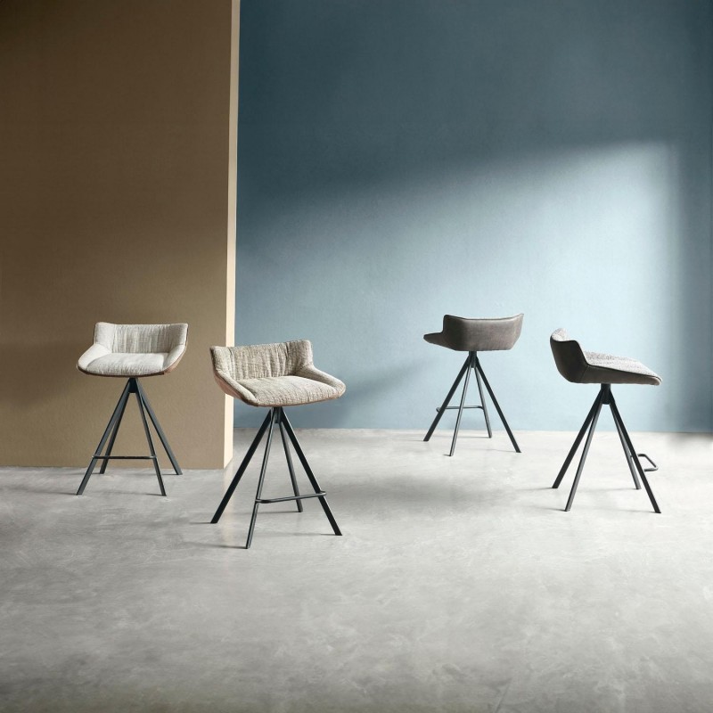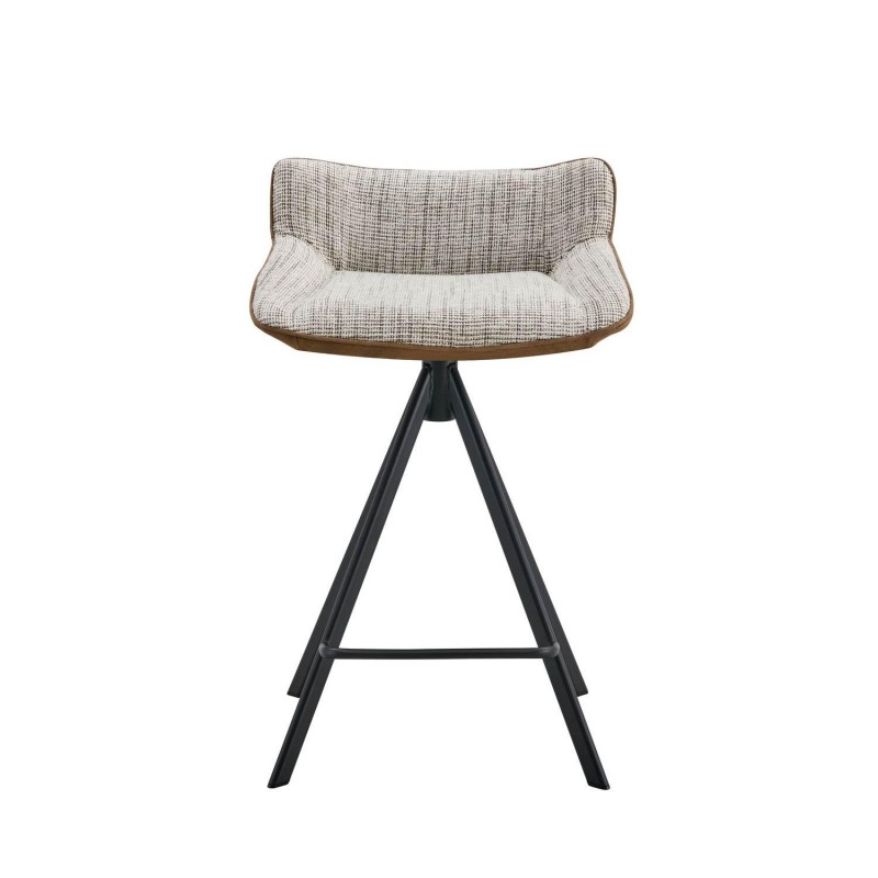 La base de este taburete está compuesta por patas de metal negro, las cuales están ligeramente inclinadas hacia afuera para proporcionar una base firme y estable. Además, el reposapiés no solo añade un toque estético, sino que también refuerza la estructura del taburete, asegurando su durabilidad y resistencia para un uso diario prolongado.