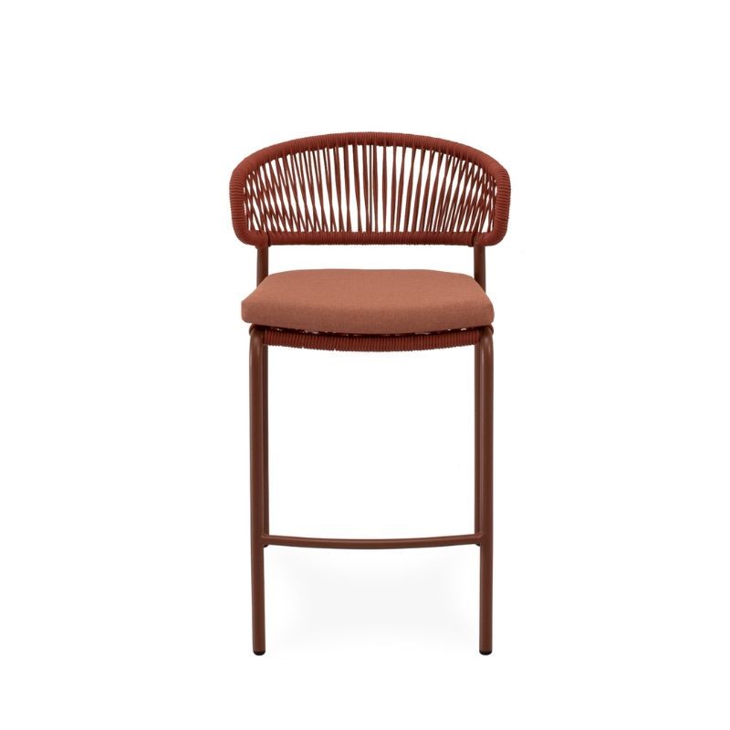 El taburete de exterior RANDALL terracota cuenta con un respaldo curvo, tejido en cuerda resistente, y patas de acero con tratamiento exclusivo para exteriores.