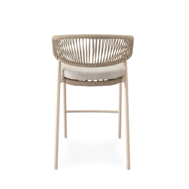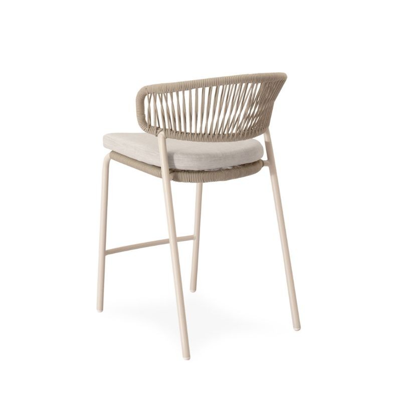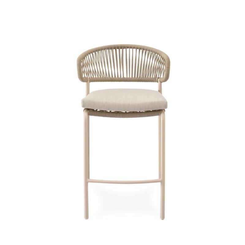 El taburete de exterior RANDALL beige cuenta con un respaldo curvo, tejido en cuerda resistente, y patas de acero con tratamiento exclusivo para exteriores.