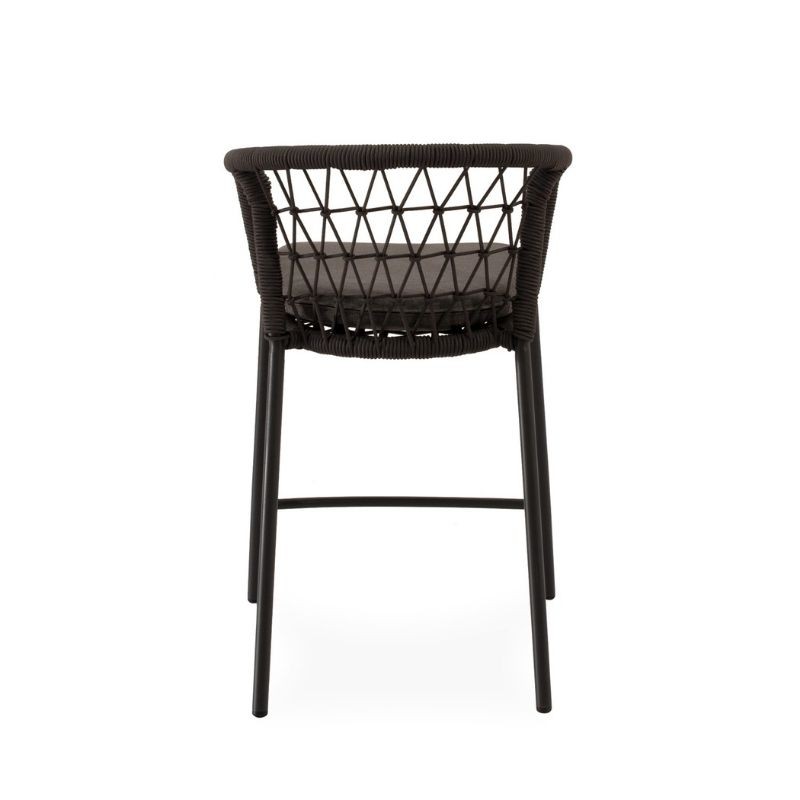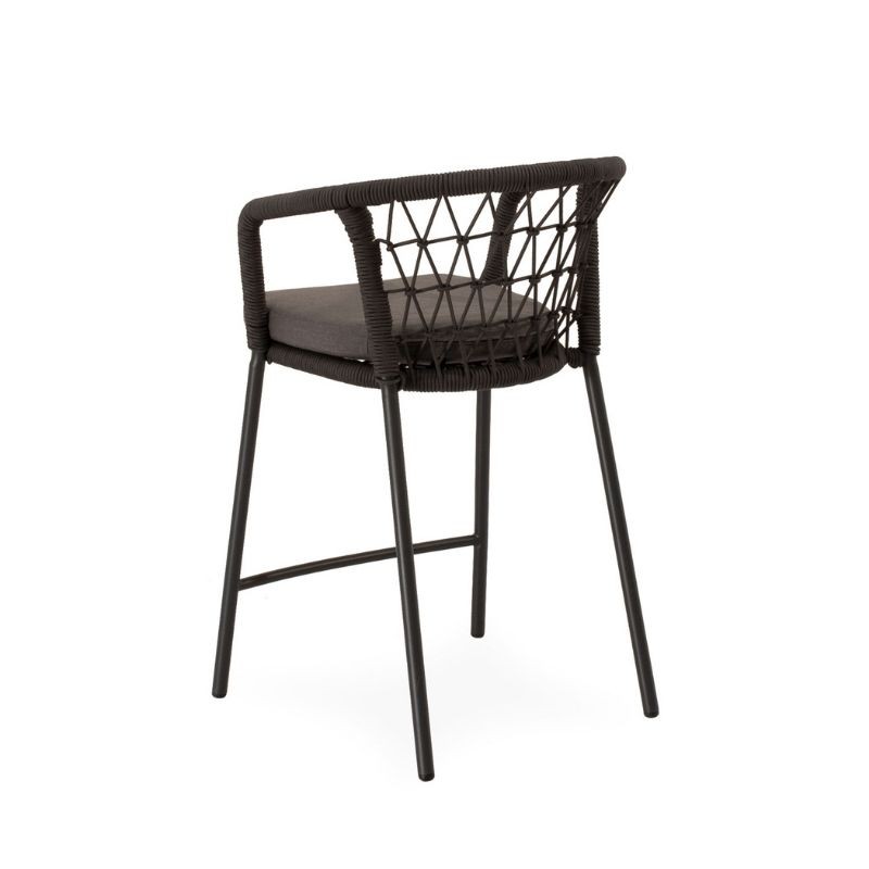 El taburete de exterior EDWIN gris tiene respaldo curvo, envuelto en cuerda entrelazada, y patas de acero robustas y ligeramente inclinadas.