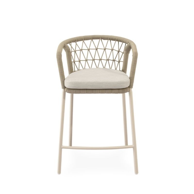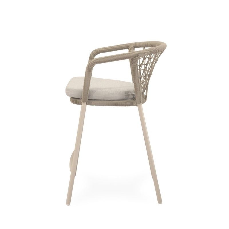 El taburete de exterior EDWIN beige tiene respaldo curvo, envuelto en cuerda entrelazada, y patas de acero robustas y ligeramente inclinadas.
