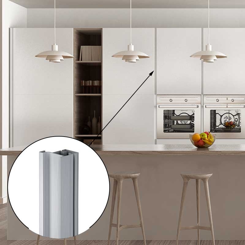Perfil tirador gola en aluminio acabado natural para instalación vertical en muebles de cocina.