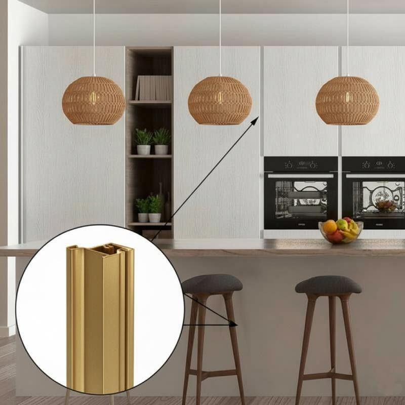 Perfil tirador gola en acabado oro para instalación vertical en muebles de cocina.