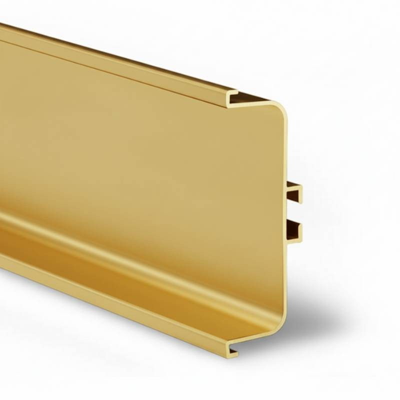 Perfil tirador semioculto sistema gola intermedio para muebles de cocina , en acabado oro. El acabado oro representa la máxima expresión de elegancia y sofisticación en el mundo de la decoración, ofreciendo soluciones de vanguardia que transformarán por completo cualquier proyecto que se plantee.