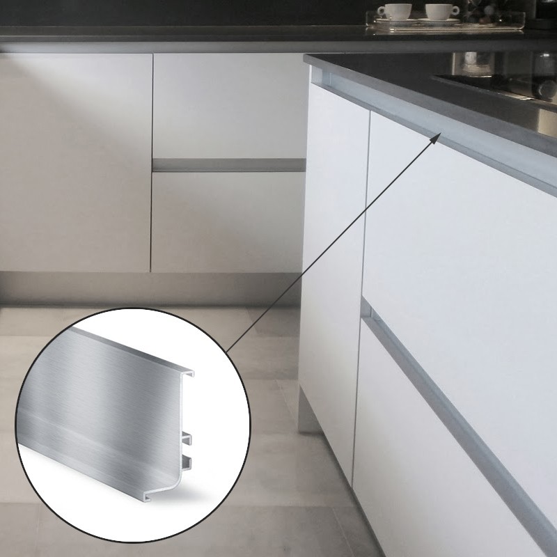 Perfil tirador semioculto sistema gola superior para muebles de cocina fabricado en acero inoxidable.