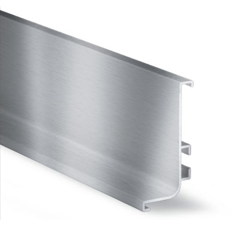 El perfil tirador semioculto se presenta en un sofisticado acabado de acero inoxidable cepillado, un tono que evoca modernidad y limpieza. Su brillo sutil y neutro combina con cualquier estilo de cocina, aportando ligereza visual y un aire profesional digno de los espacios más actuales.
