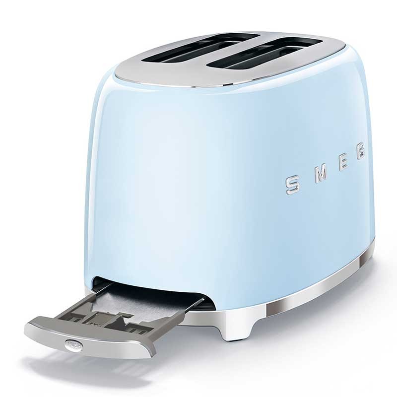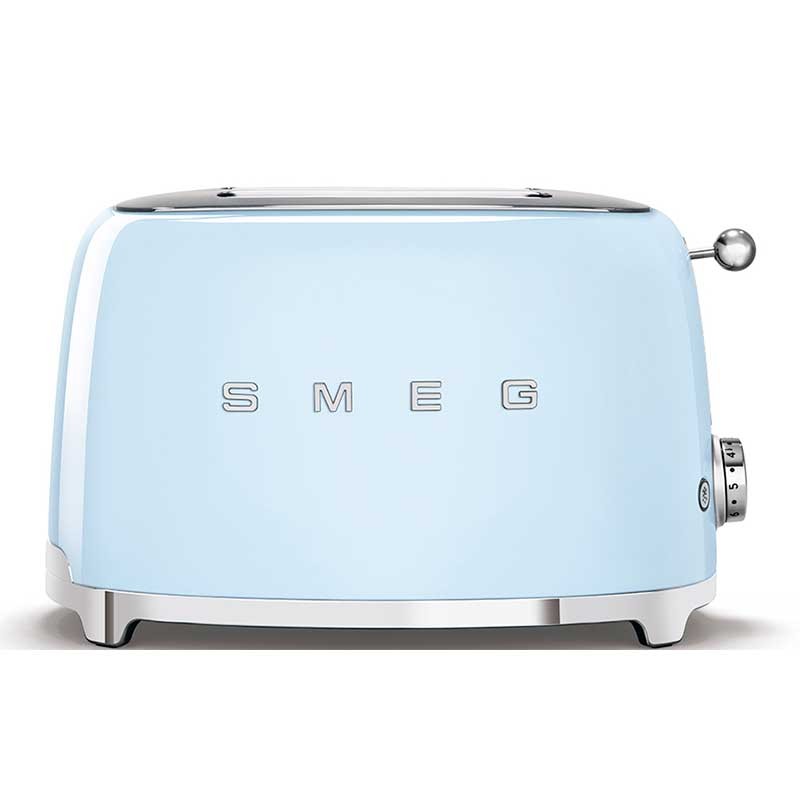 Tostadora Smeg 50's Style con cuerpo en acero inoxidable color azul cielo brillo con 6 niveles de calentamiento y 2 ranuras para 2 tostadas.