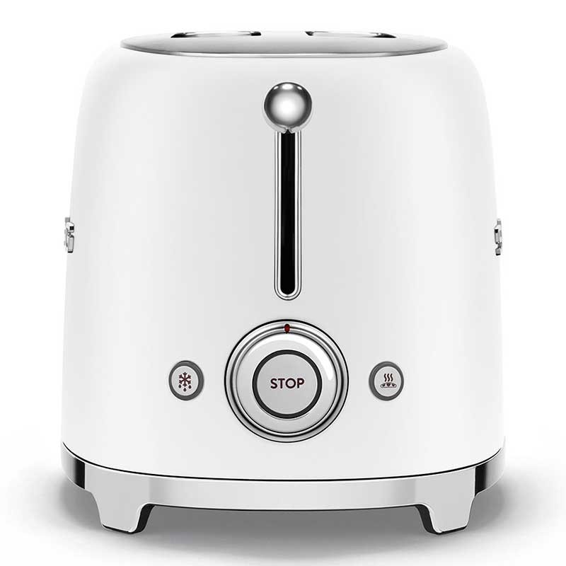 Tostadora Smeg 50's Style con cuerpo en acero inoxidable color blanco mate con 6 niveles de calentamiento y 2 ranuras para 2 tostadas.