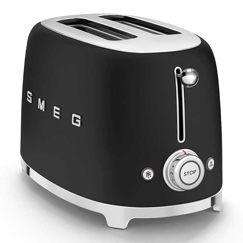 Tostadora Smeg 50's Style con cuerpo en acero inoxidable color negro mate con 6 niveles de calentamiento y 2 ranuras para 2 tostadas.