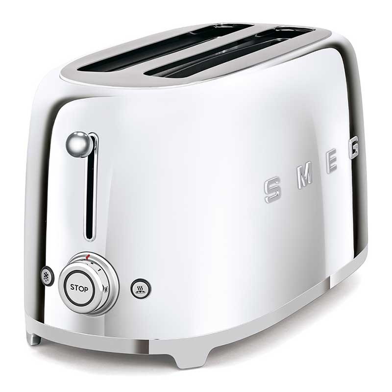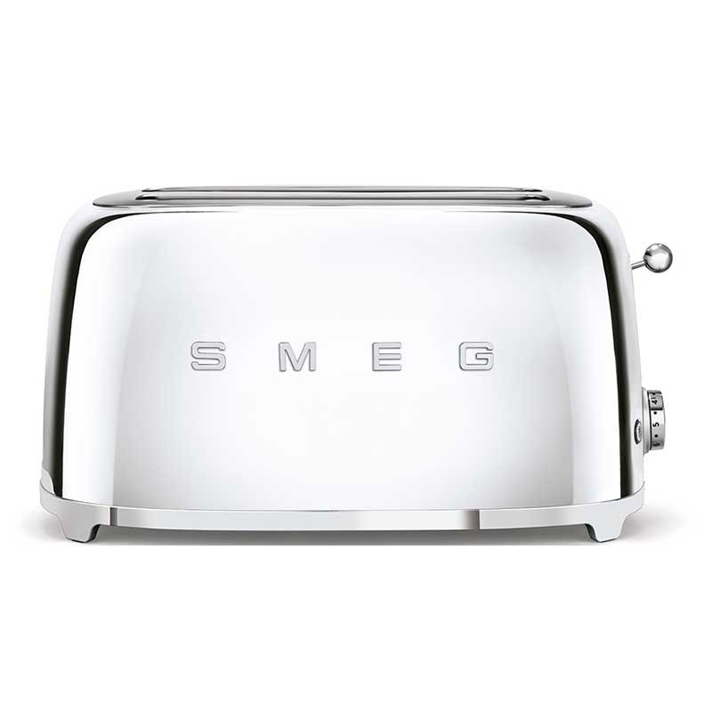 Tostadora Smeg 50's Style con cuerpo en acero inoxidable acabado cromo brillo con 6 niveles de calentamiento y 2 ranuras para 4 tostadas.