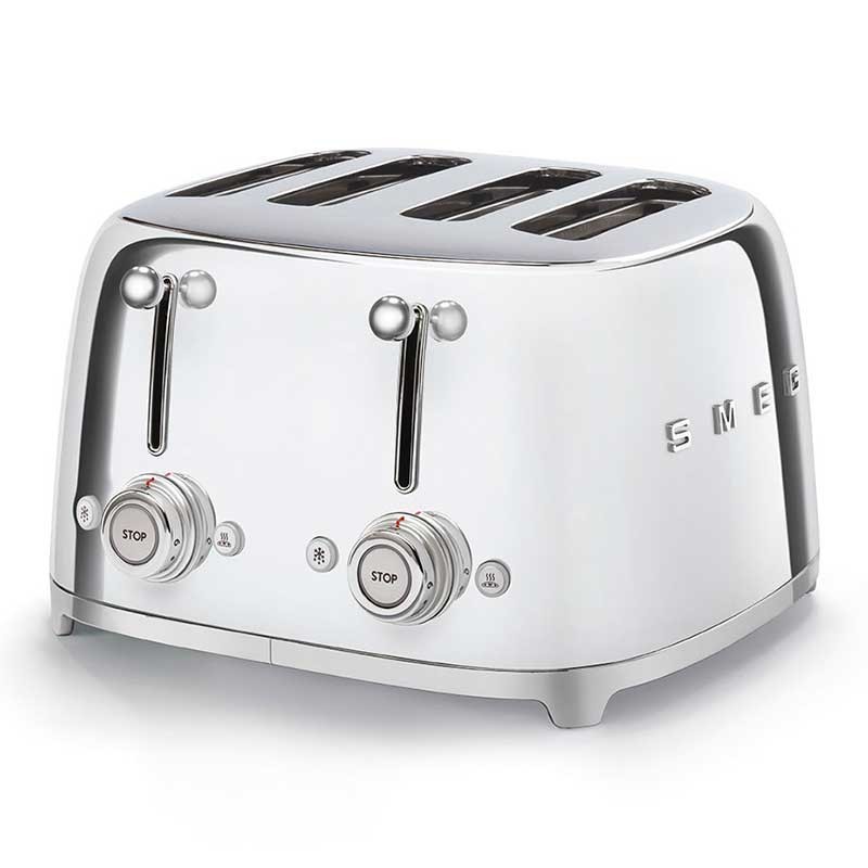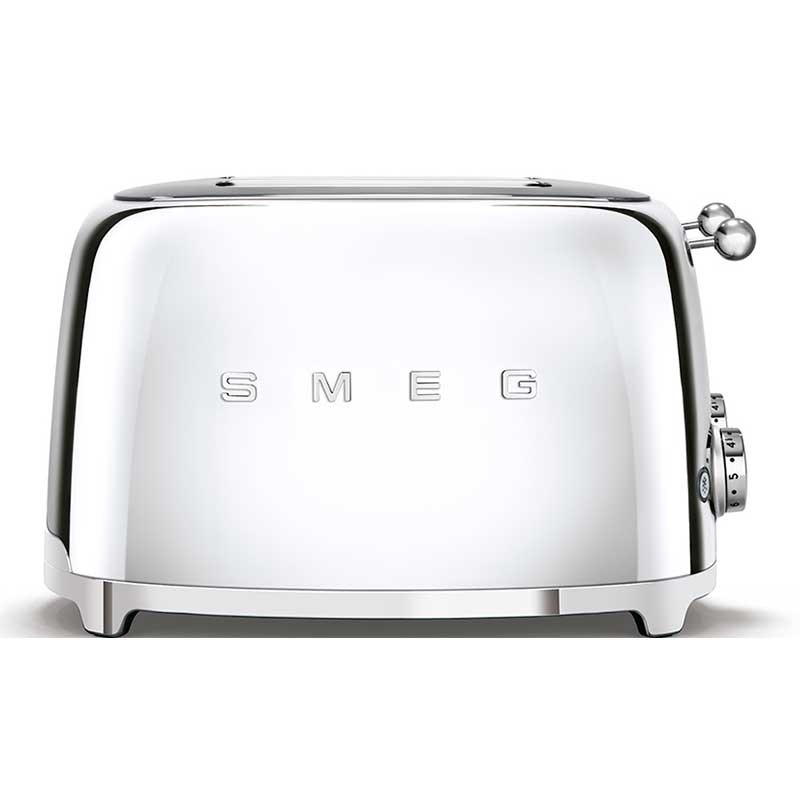 Tostadora Smeg 50's Style con cuerpo en acero inoxidable acabado cromo brillo con 6 niveles de calentamiento y 4 ranuras para 4 tostadas.