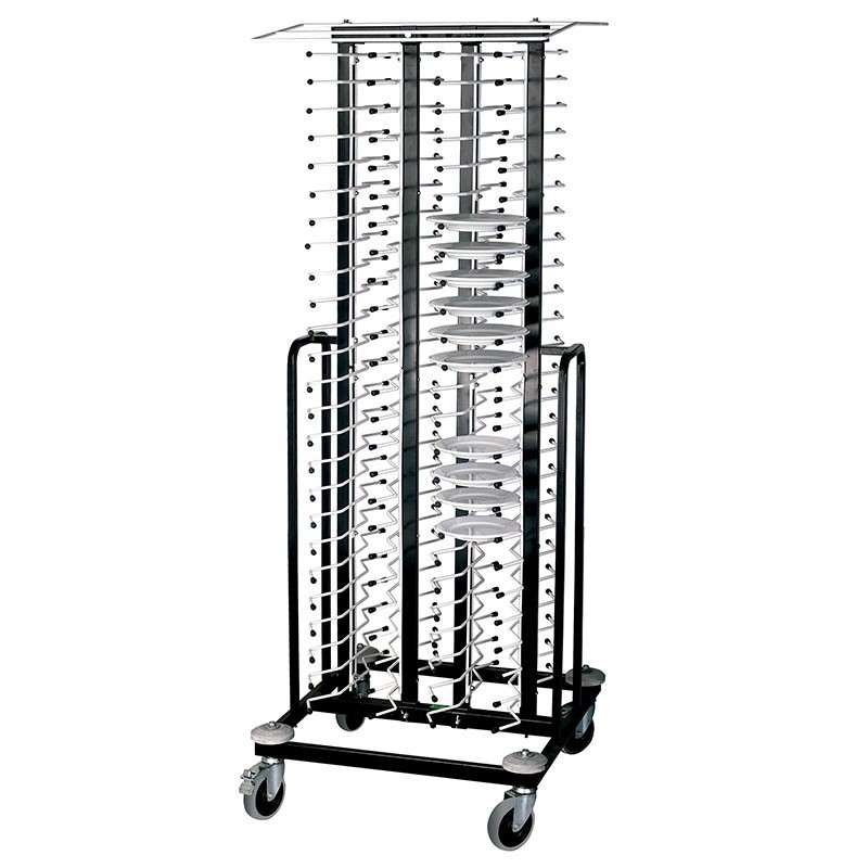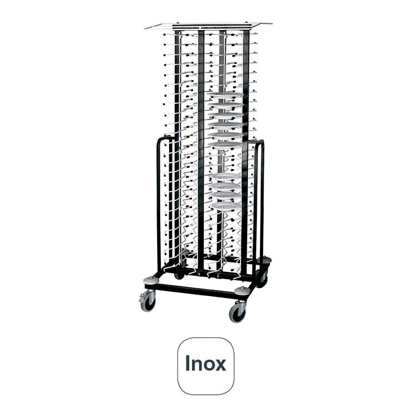 Carro portaplatos vertical con ruedas, de 195 cm de alto y con capacidad para 100 platos fabricado en acero inoxidable de gran calidad y excelente resistencia a la corrosión.