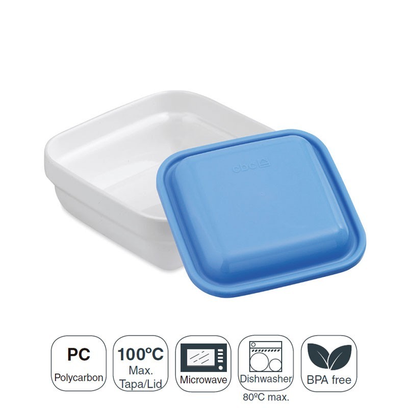 Bol cuadrado de 12x12x4,5 cm con tapa fabricado en policarbonato. Compatible con bandejas isotérmicas B1 destinadas a la distribución de comidas en hospitales, residencias, etc.