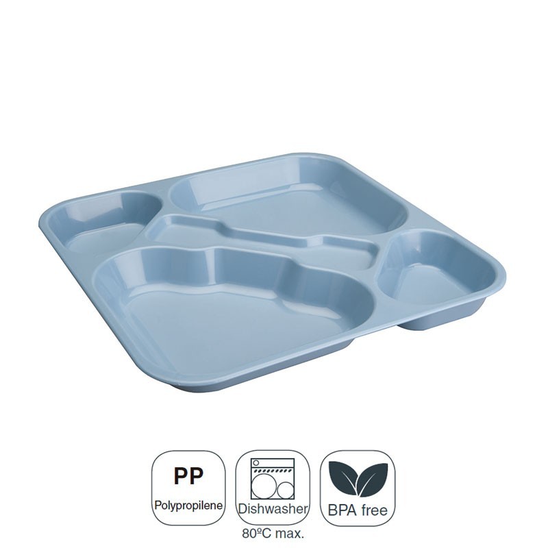 Bandeja de 33x33 cm para autoservicio fabricada en polipropileno. Ideal para uso en hospitales, residencias, colegios, comedores, buffets, etc.
