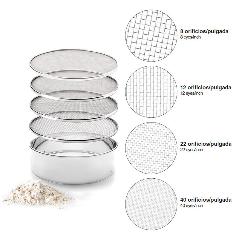 Incluye 4 mallas intercambiables para tamizar en diferentes grosores tal y como se detallan a continuación:
