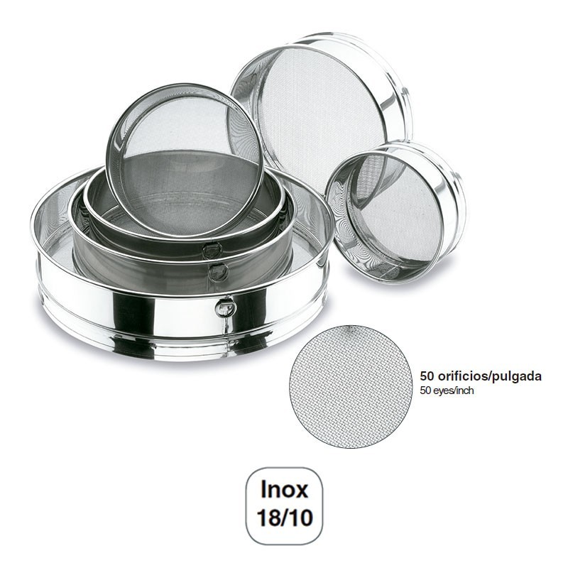 Cedazo de acero inoxidable 18/10 de tamizado muy fino de 50 orificios por pulgada ideal para tamizar harinas o productos similares en elaboraciones de repostería.