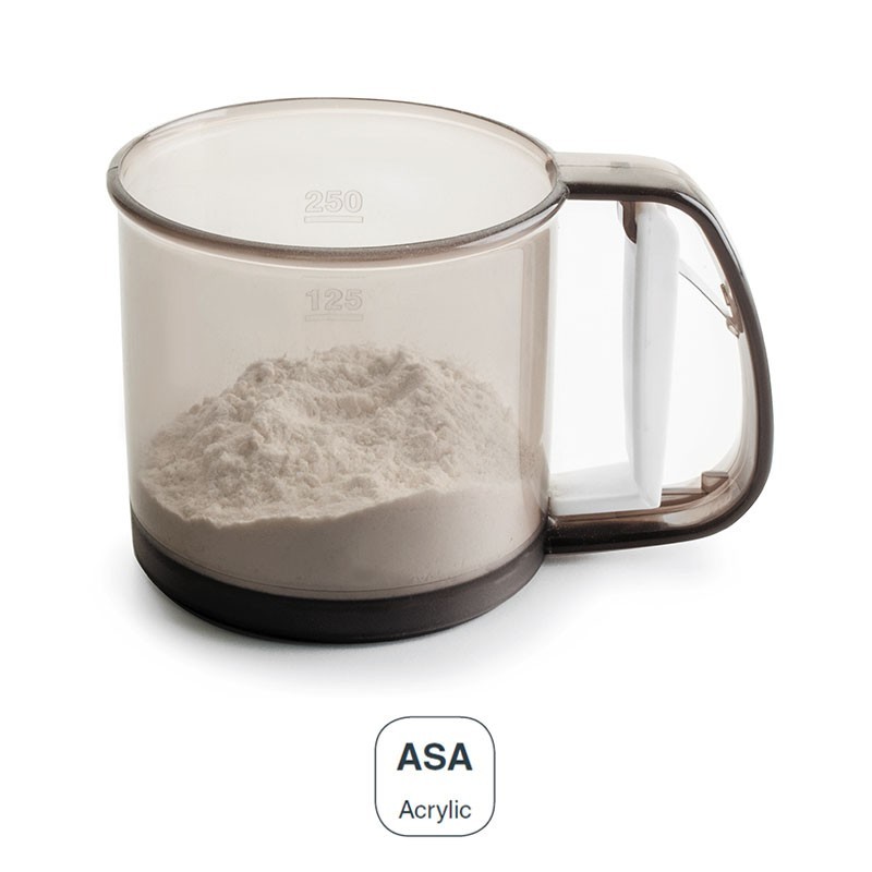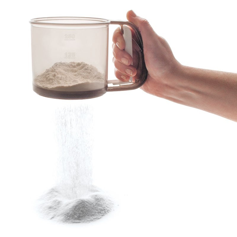 Cribador de harina de 10 cm de diámetro y 0,35 kg de capacidad fabricado en plástico acrílico de gran resistencia. Accionamiento por gatillo.
