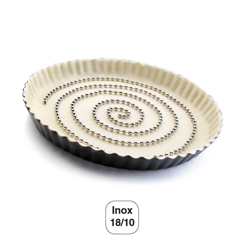 Cadena de 1,8 metros de longitud para evitar que las masas de tartas y pasteles suban en exceso al hornearlas. Está fabricada en acero inoxidable 18/10 de alta calidad y excelente resistencia a la corrosión.
