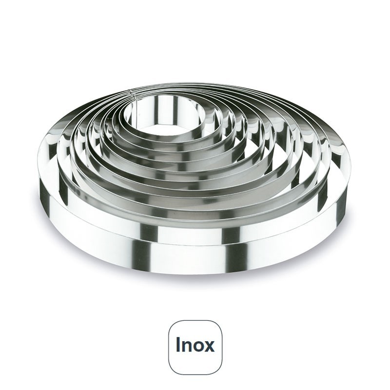 Aro redondo de acero inoxidable de 4,5 cm de altura para emplatar guarniciones, ensaladas, postres o montar platos como un steak tartar o similares. Disponible en varios diámetros.