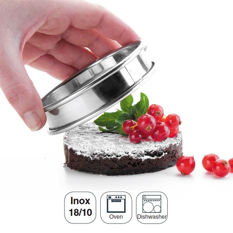 Aro redondo de acero inoxidable 18/10 con bordes redondeados y 2,2 cm de altura ideal para emplatar pequeñas guarniciones o postres. Disponible en varios diámetros.