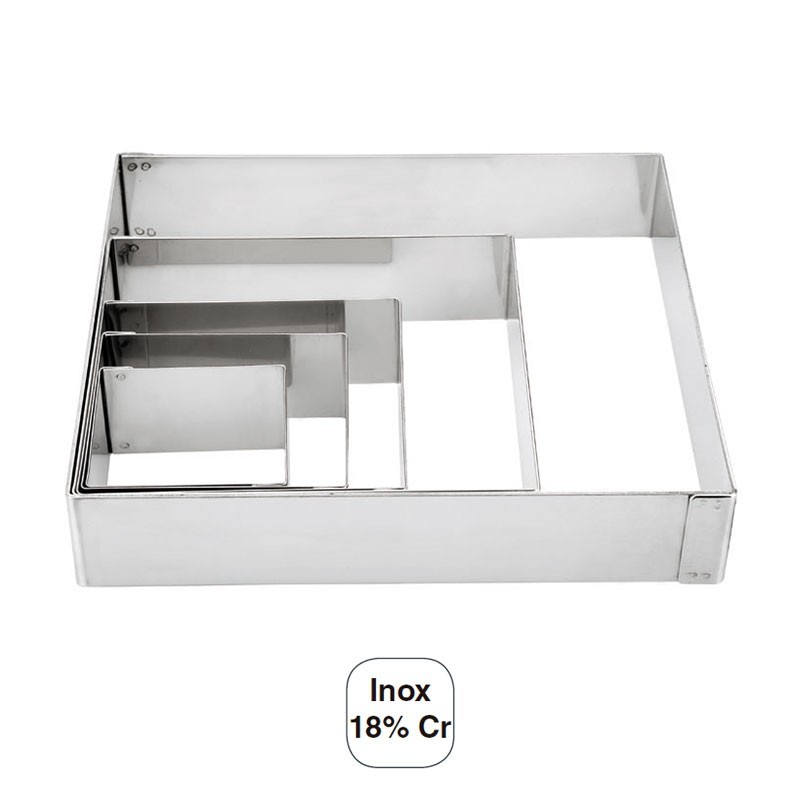 Molde cuadrado de acero inoxidable 18/10 de 4 cm de altura para emplatar guarniciones, ensaladas, postres o montar platos como un steak tartar o similares. Disponible en varias medidas.
