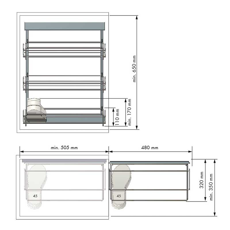 Bastidor extraible en acero plata-cromo con guías laterales con cierre amortiguado y 3 cestas para zapatos. Instalación sobre un costado de armario.