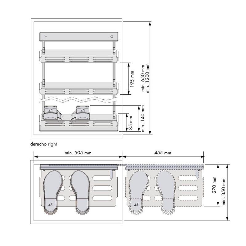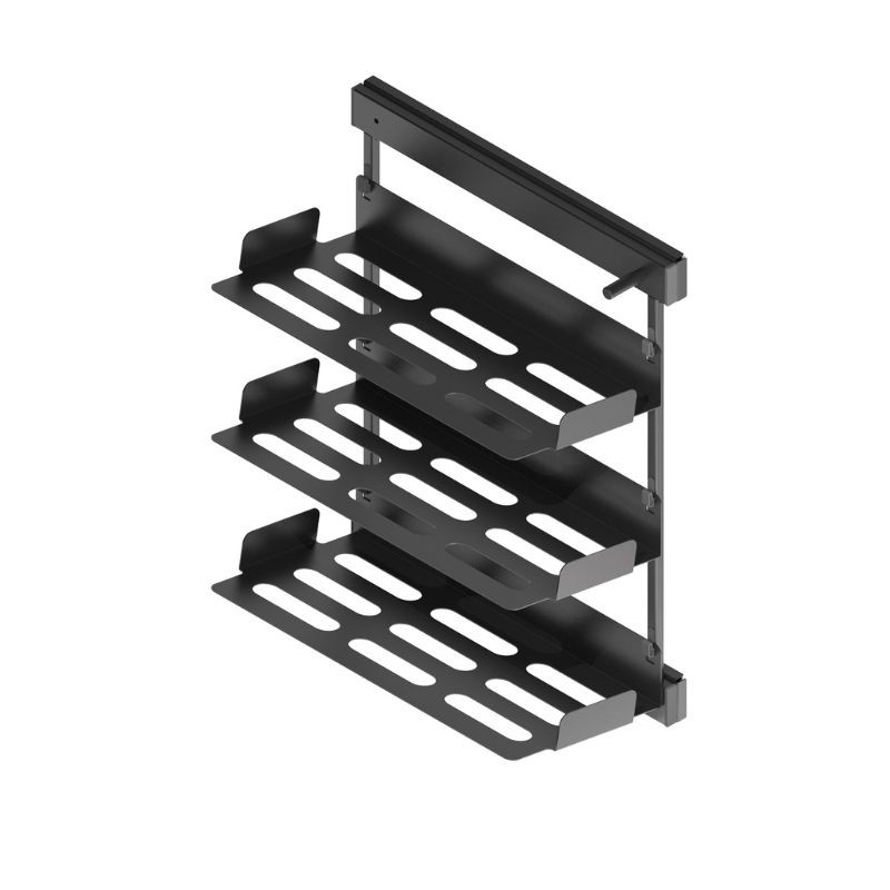 Bandejas de acero pintado en color antracita para conformar un zapatero ideal para tu armario o vestidor. Cuenta con cierre amortiguado y extracción total. Soporta una carga máxima de 30 kg.