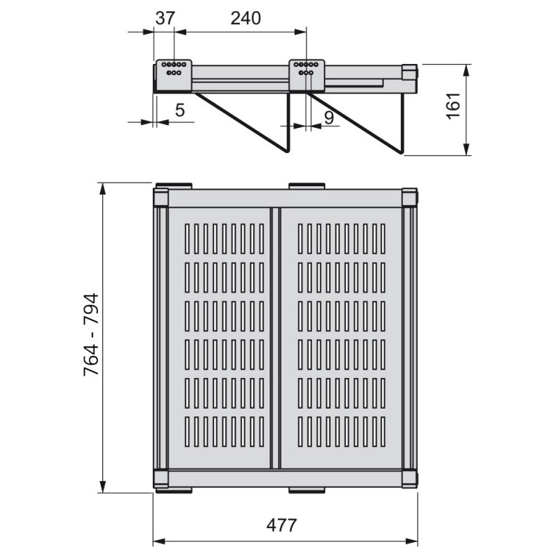 Cajón zapatero y bastidor con guías ocultas de extracción total y cierre suave, además de con un sistema de clipado automático y rápido para la instalación del bastidor. Éste es regulable para poder adaptarlo al hueco interior del armario y están fabricados en aluminio pintado en color moka.